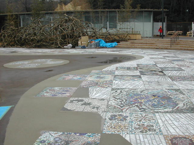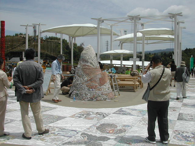 オブジェを作っているときの状況です。 床に白いものが並んでいます。これが床モザイクです。 奥のテントの下の円錐形のものがモザイクオブジェです。 |