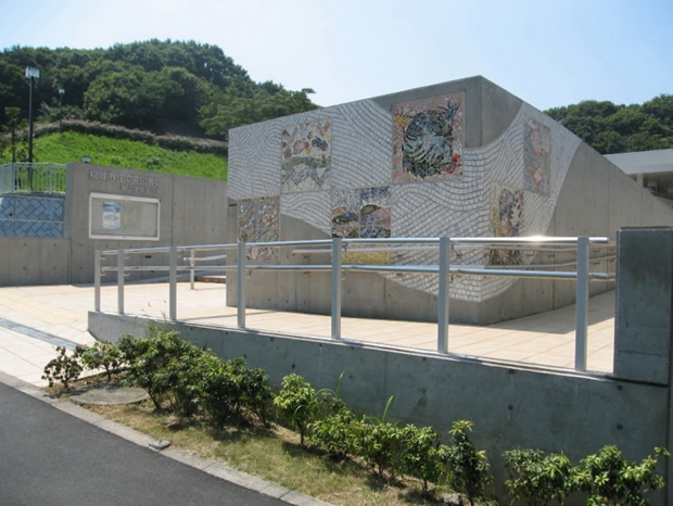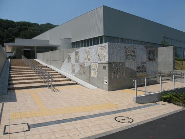 稲城市のワークショップでは13枚のパネルが作られました。 7月暑い盛りのワークショップで大いに汗をかいたことが印象に残っています。 新設の図書館がタイミングよく作られ、エントランスの壁という最高の場所を頂きました。 万博会場で何百万人もの人の足に踏まれ、壊れたり、色が薄れたりした陶片がいくつもあります。 ところがその磨耗し、破損した表情がとても面白く、仕上がった当初より味のある面白い表情になったようです。